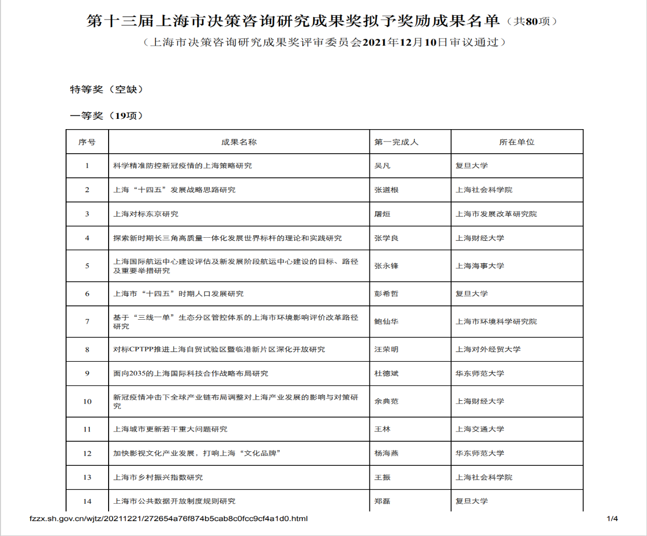 2021年12月21日,經上海市決策咨詢研究成果獎評審委員會審議通過,《科學精準防控新冠疫情的上海策略研究》等80項成果擬獲第十三屆上海市決策咨詢研究成果獎。根據《上海市決策咨詢研究成果獎勵規定》及其實施細則的相關規定,現將擬予獎勵的研究成果名稱等信息予以公示,公示期為30天(從本公告發布之日起計算)。