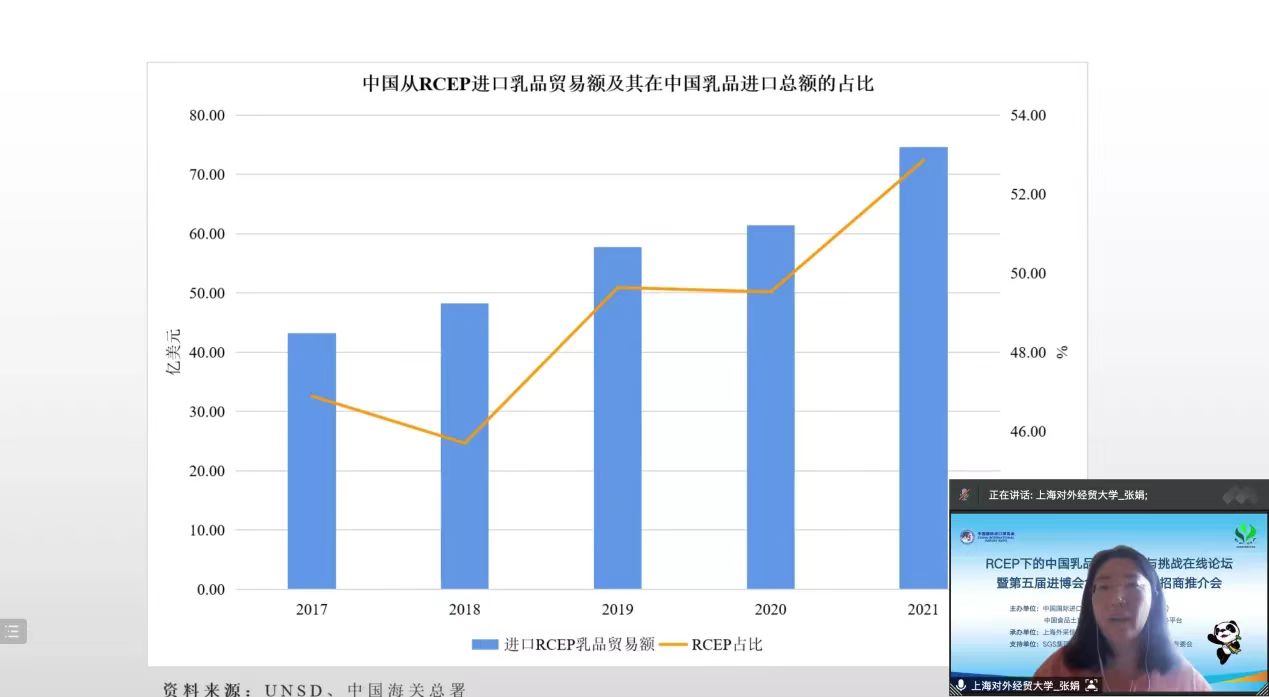 2022年4月27日下午,第五屆進博會食品展區招展招商推介會暨RCEP下的中國乳品行業機會與挑戰在線論壇成功舉辦。上海對外經貿大學國際經貿研究所張娟副研究員分享了中國乳制品進口貿易現狀和特點,乳制品行業RCEP關稅減讓安排建議,以及RCEP實施對乳制品進口的影響,并對從事乳制品進口的相關企業提出合理化建議。