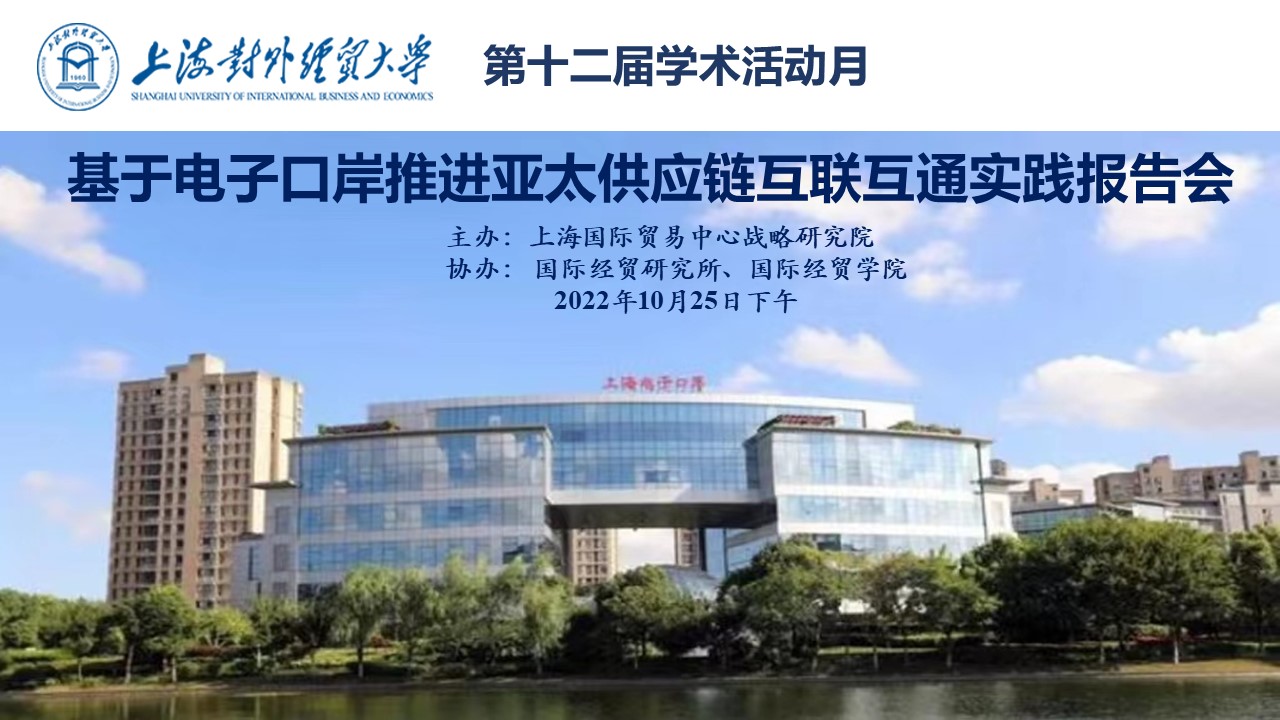 10月25日,由上海對外經貿大學上海國際貿易中心戰略研究院主辦,上海對外經貿大學國際經貿研究所、國際經貿學院協辦的“基于電子口岸推進亞太供應鏈互聯互通實踐報告會”開幕。來自上海亞太示范電子口岸網絡、上海億通國際股份有限公司、上海對外經貿大學的大約30名校內外專家和學生通過騰訊會議參加了本次會議。