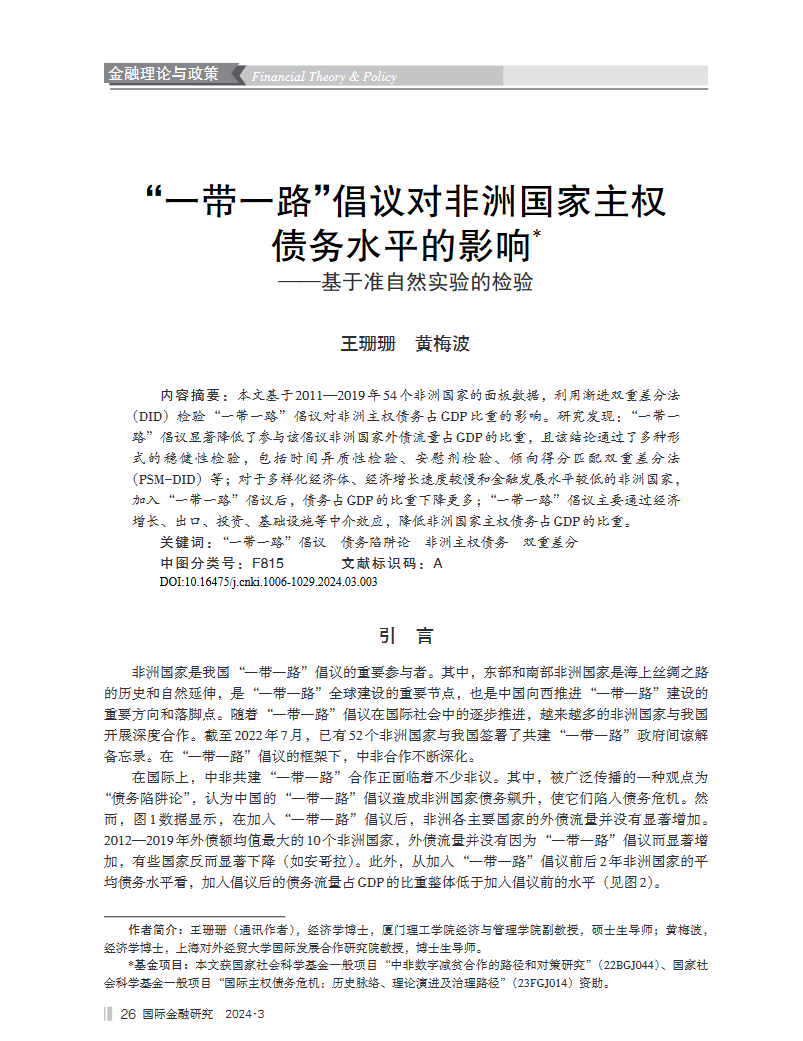 王珊珊 黃梅波 “一帶一路”倡議對(duì)非洲國(guó)家主權(quán)債務(wù)水平的影響——基于準(zhǔn)自然實(shí)驗(yàn)的檢驗(yàn),國(guó)際金融研究 2024年04月