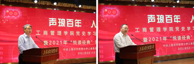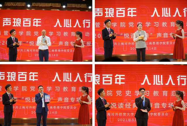 本次匯報會以聲音形式展現了建黨百年的光輝歷史,以情景劇、微電影、朗誦、合唱等形式為載體,帶領與會師生感悟黨的創新理論、體認黨的精神譜系,傳承黨的紅色基因。會上黨委書記武增勇老師宣讀《工商管理學院2021年黨史學習教育方案》,引導廣大師生以學黨史、悟思想、辦實事、開新局為重點任務,做到學史明理、學史增信、學史崇德、學史力行。隨后,武增勇老師與黨委宣傳部部長郭茜、黨委組織部副部長劉素貞、學工部副部長趙靜共同發布“悅讀經典”形象標識。