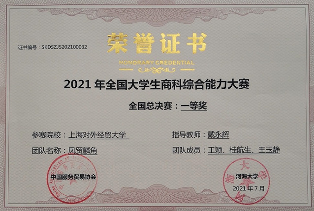 近日,全國大學生商科綜合能力大賽圓滿結(jié)束。本次大賽由中國服務(wù)貿(mào)易協(xié)會、河海大學聯(lián)合主辦,涵蓋了來自全國近百所高校的537支隊伍,包括武漢大學、中南財經(jīng)政法大學、安徽大學、南昌大學、江西財經(jīng)大學、河海大學等??紤]到疫情的影響,本次大賽采用線上比賽方式,分為地區(qū)賽、全國半決賽,全國總決賽三個階段,歷時近10個月,最終有78支隊伍晉級全國總決賽。由我院戴永輝老師指導(dǎo)的工商管理學院研究生團隊(成員:王穎、桂航生、王玉靜)晉級全國總決賽,并榮獲一等獎。