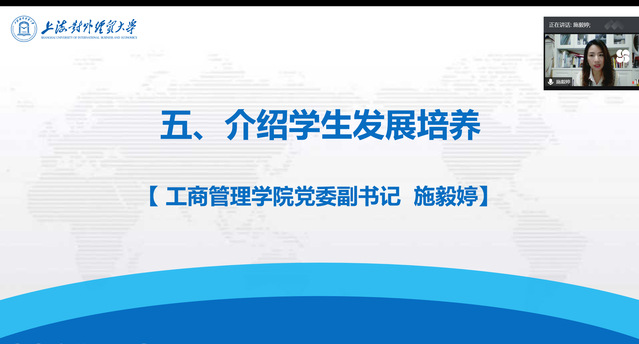 工商管理學院黨委副書記施毅婷介紹學生發展培養體系。她談到,工商管理學院作為我校“三全育人”綜合改革試點單位,以推動人才培養理念和培養方式變革為著眼點,聚焦“實踐育人”生態圈建設,調動一切積極因素,推動基層黨建、專業課實踐教學、社會實踐、志愿服務、網絡思政等載體有機融合,全方位為學生成長成才保駕護航。