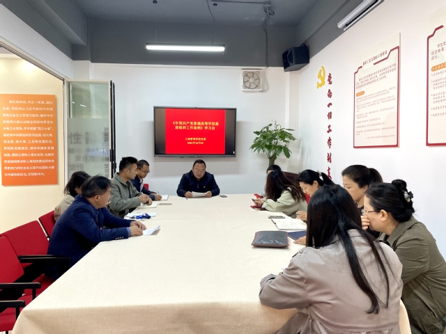 《中國共產黨普通高等學校基層組織工作條例》對高校基層黨組織工作作出全面規范,體現了近年來高校黨建工作的理論、實踐和制度創新成果,是新時代高校黨的建設的基本遵循。為了深入學習貫徹落實好《條例》提出的相關要求,工商管理學院黨委于2021年10月29日在黨建服務中心召開《中國共產黨普通高等學校基層組織工作條例》集體學習會,參加集體學習的有學院黨委委員、學院支部書記,會議由學院黨委書記武增勇主持。