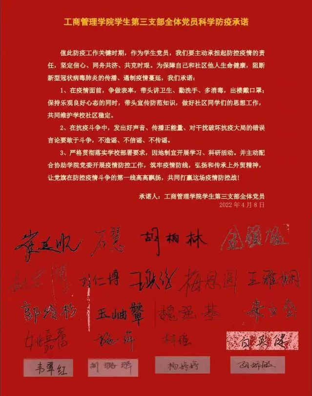 工商管理學院第三黨支部多次組織開展線上會議,突出黨課教育教學活動,強化支部黨員的黨性教育,共同學習上級黨委的各項防疫精神指示以及《上海市致全市黨員的一封信》的精神內涵,積極開展防疫工作安排,動員鼓舞支部黨員積極參與到社區疫情防控工作之中,主動承擔黨員的應盡之責。4月8日,支部全體成員在黨員防疫承諾書上簽字,共同凝聚起科學防疫的堅定信心與紅色力量。習近平總書記曾指出:“學習黨章是全體黨員的基本功,這個功課要經常做。”4月12日在支部組織生活會上,支部書記崔延順帶領全體黨員再次加強《黨章》學習,特別結合當前疫情防控工作,對照黨員的八項義務深刻領學,把黨章內化于心外化于行,并在組織生活會上莊嚴宣讀科學防疫承諾書,再次增強了支部全體黨員主動擔當、沖鋒在前的信念與決心。