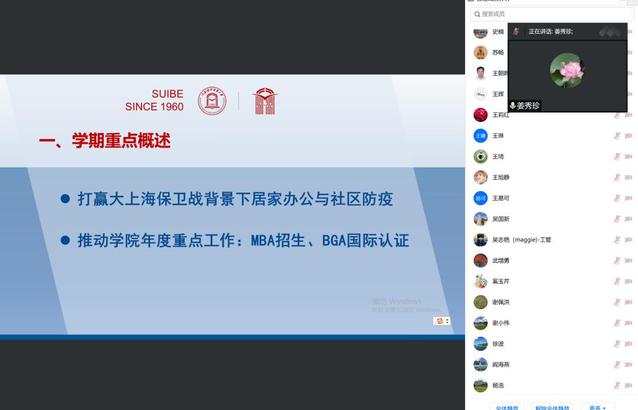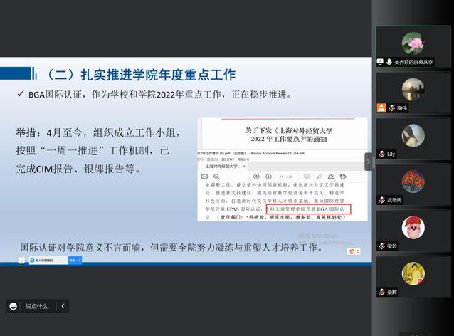 首先,院長(zhǎng)姜秀珍教授作學(xué)院工作報(bào)告。他分別以“打贏大上海保衛(wèi)戰(zhàn)背景下居家辦公與社區(qū)防疫”及“推動(dòng)學(xué)院年度重點(diǎn)工作:MBA招生、BGA國(guó)際認(rèn)證”兩部分展開匯報(bào),回顧了學(xué)院在2022年度春季學(xué)期前半段的工作進(jìn)展及成效。