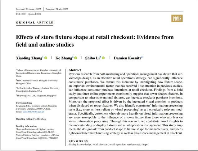 工商管理學院張曉靈教授作為第一作者與合作者完成的Effects of Store Fixture Shape at Retail Checkout: Evidence from Field and Online Studies”一文發表在Production and Operations Management (POMS) 202332卷第10期。