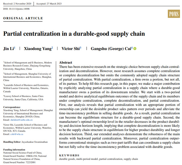 同時,工商管理學院楊曉東老師作為通訊作者的論文《Partial Centralization in a Durable-Good Supply Chain》在國際商科頂級期刊Production and Operations Management (POM) 正式發表。這是楊曉東老師自2019年調入我校以來發表的第二篇國際商科頂級期刊論文。