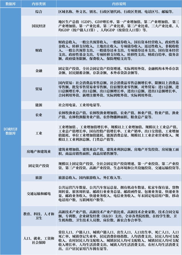 區域經濟數據庫收錄數據的時間跨度為2000年至今,具體包括:國民經濟核算、固定資產投資和房地產、對外經濟貿易、財政、人民生活、社會消費零售總額、金融業等各方面的數據。