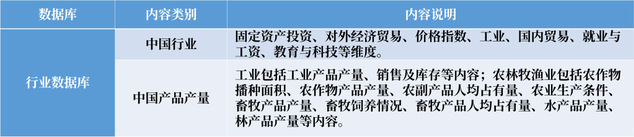 行業數據庫包含中國行業年度數據,收錄數據的時間跨度為1949年至今,按全國、分行業、分省市查詢。該數據庫涵蓋建筑、制造、金融、信息傳輸、軟件、信息技術服務、文化、體育、娛樂、農林漁牧、水利、環境和公共設施管理等各行各業;主要包括固定資產投資、對外經濟貿易、價格指數、工業、國內貿易、就業與工資、教育與科技等內容。