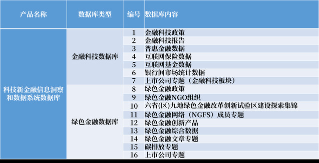 綠色金融政策、六省(區)九地綠色金融改革創新試驗區建設探索集錦、綠色金融網絡(NGFS)成員專題、綠色金融文章專題、碳排放專題、上市公司專題、中國企業ESG評分、全球企業污染排放和ESG評分數據、中國企業排放數據和環境專利數據、標普ESG可持續發展金融全球企業分析數據庫、歐洲太陽能數據。