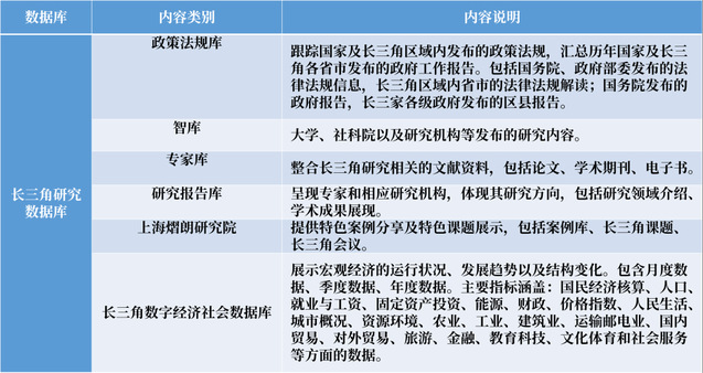 數字長三角數據庫收錄數據的時間跨度為2015年至今,主要覆蓋長三角一體化區域內26個省市,在保證數據字段豐富的同時,對應到具體的縣區數據。子庫分為政策法規庫、智庫報告、研究報告庫、專家庫和長三角數字經濟數據,包括長江三角洲地區的經濟、社會、貿易、資源、環境、基礎設施、投資環境等內容。
