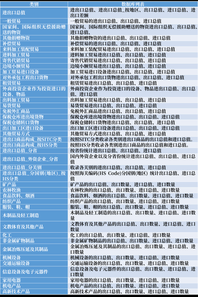 中國海關進出口數據庫按照商品類別、國家、地區、企業性質等不同分類方式收錄中國海關進出口值與進出口數量;共計700 多張數據表,29000 多個熱門指標。