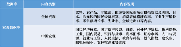 宏觀數據庫收錄數據的時間跨度為1949年至今,包含國內外年度、季度、月度宏觀數據。主要包括:國民經濟核算、固定資產投資、財政、對外貿易經濟、價格指數、工業、國內貿易、銀行貨幣、利率匯率、證券市場、人口與資源、就業與工資、人民生活、教育與科技、景氣指數、建筑業、郵電運輸業、農林牧漁業等維度的數據。