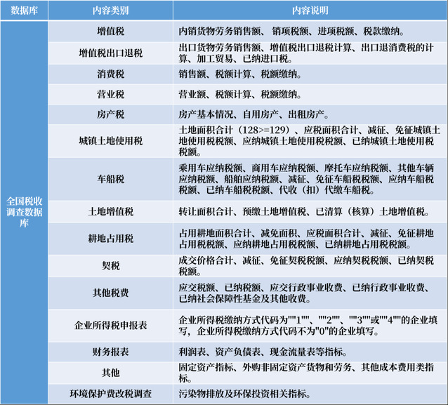全國稅收調查數據收錄了與稅務相關的年度數據,時間跨度為2007年至2016年。該數據庫具體涵蓋增值稅、增值稅出口退稅、消費稅、營業稅、房產稅、城鎮土地使用稅、車船稅、土地增值稅、耕地占用稅、契稅、其他稅費、企業所得稅申報表、財務報表、環境保護費改稅調查、其他等大類指標。