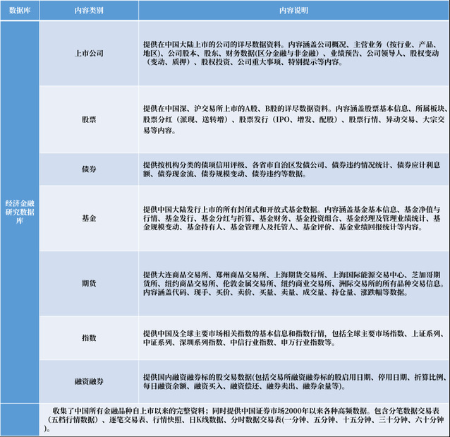 經濟金融研究數據庫集多證券品種為一體,收錄時間自1949年起,包含豐富的滬深上市公司、股票、債券、基金、期貨、外匯等年度、季度、月度和日數據,包含每日行情數據財務數據、股東股本、經營管理等金融市場所需的數據,并在此基礎上開發了的衍生類分析數據,實現了數據和信息并重,全面反映投資市場信息,方便投資者決策,以及研究者進行研究。