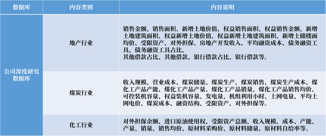 公司深度研究數據庫收錄數據的時間跨度為2011年至今,主要覆蓋地產、煤炭、化工三個行業的公司常用年度數據。地產行業包括銷售、拿地、經營和融資等方面的公司數據;煤炭行業包括煤化、煤炭、電力、貿易等業務收入和業務成本,產能、產量、銷量、銷售均價等公司數據;化工行業包括收入規模、成本、產能、產量、銷量、銷售均價、原材料采購量、原材料采購價、原材料儲量、原材料自給率等。通過分行業、分公司查詢數據。