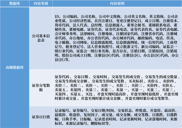 高頻數據庫收集了在中國證券市場上市的各種高頻數據,收錄數據的時間跨度為2000年至今,金融品種主要包括:股票、債券、期貨,頻率主要包含:分筆數據交易表(五檔行情數據),日K線數據、分時數據交易表(一分鐘、五分鐘、十五分鐘、三十分鐘、六十分鐘)等高頻數據。