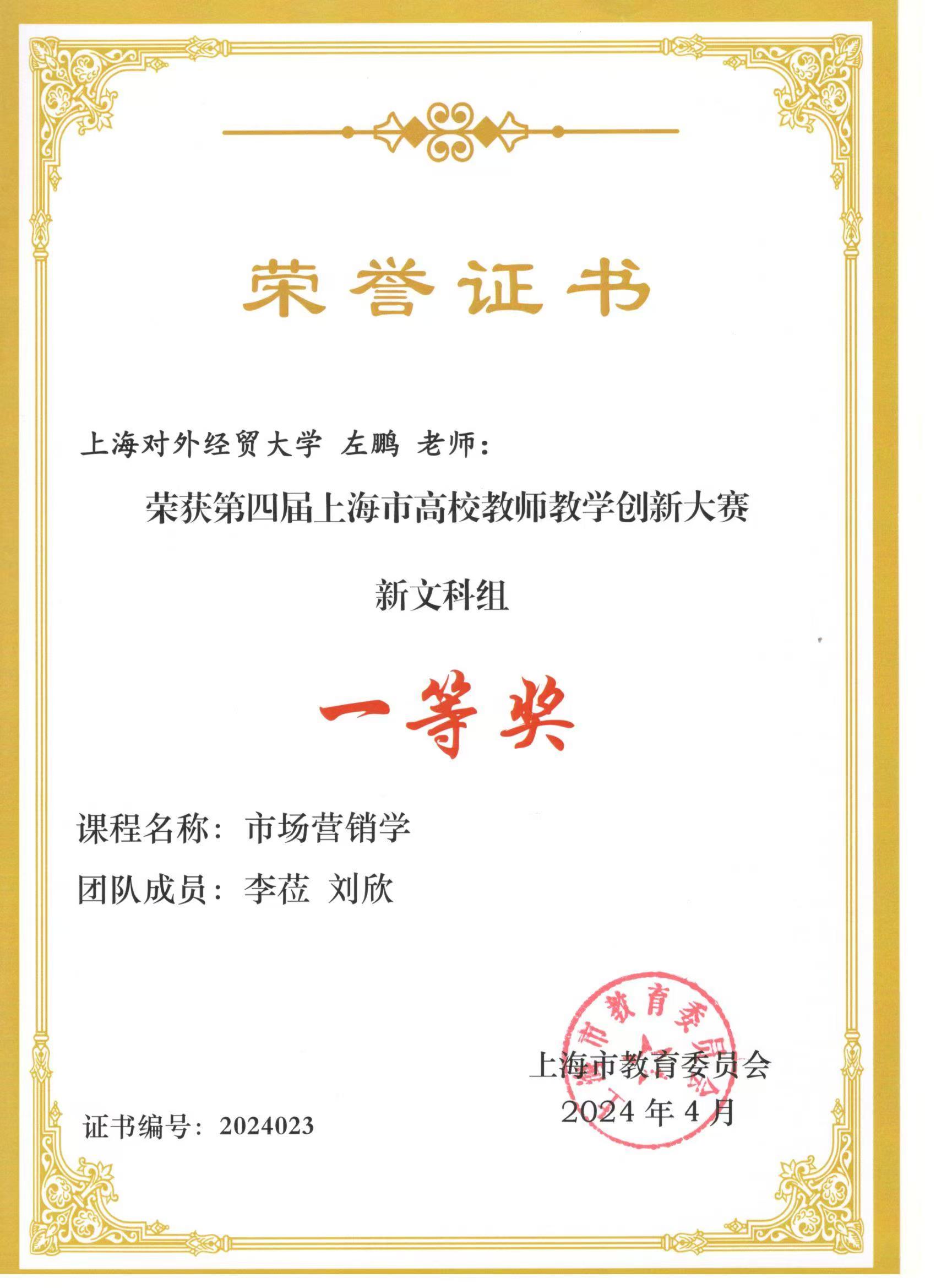 經上海市教育委員會批準,左鵬老師榮獲第九屆中國國際“互聯網+”大學生創新創業大賽上海賽區優秀指導教師。