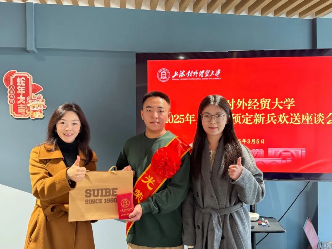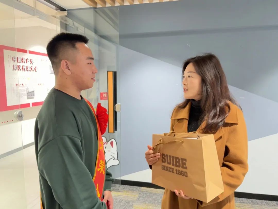 在近日舉行的2025上半年預定新兵歡送座談會后,工商管理學院黨委副書記張瑞娟、23級本科生輔導員胡心鈺為即將踏上軍旅征程的溫昱同學送上真摯的祝福與殷切的期盼。工商管理學院黨委副書記張瑞娟老師高度贊揚了溫昱同學積極響應國家號召、投身國防事業的愛國情懷,并勉勵他在軍營中錘煉意志、增長才干,早日成為一名合格的軍人,為母校爭光,為祖國添彩。