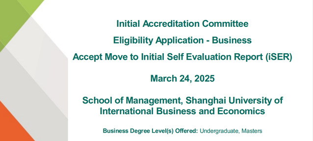 近日,工商管理學院在國際認證工作中再傳喜訊。3月24日,我院收到AACSB初始認證委員會(IAC)的正式通知:上海對外經貿大學工商管理學院已獲批AACSB的資格認證申請(Eligibility Application,EA)。這一重要進展標志著學院正式進入AACSB認證的關鍵階段,是繼UA報告通過之后取得的又一重要成果。