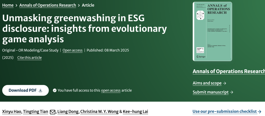近期,我校工商管理學院郝欣宇博士以第一作者合作撰寫的Unmasking greenwashing in ESG disclosure: insights from evolutionary game analysis一文發表于《Annals of Operations Research》。《Annals of Operations Research》為SCI一區、ABS 3星期刊,ABDC A類期刊,最新影響因子為4.4,被我校列為國際二類II期刊。
