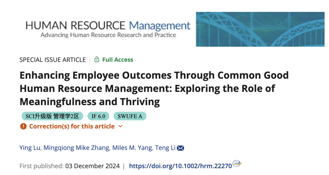 近期,工商管理學院教師李騰博士為通訊作者的合作論文《Enhancing Employee Outcomes Through Common Good Human Resource Management: Exploring the Role of Meaningfulness and Thriving》一文發表于《Human Resource Management》2025年第64卷。《Human Resource Management》為SSCI一區期刊,是學術界公認的人力資源管理領域國際權威期刊(FT 50, ABS 4),被我校列為國際二類Ⅰ期刊。