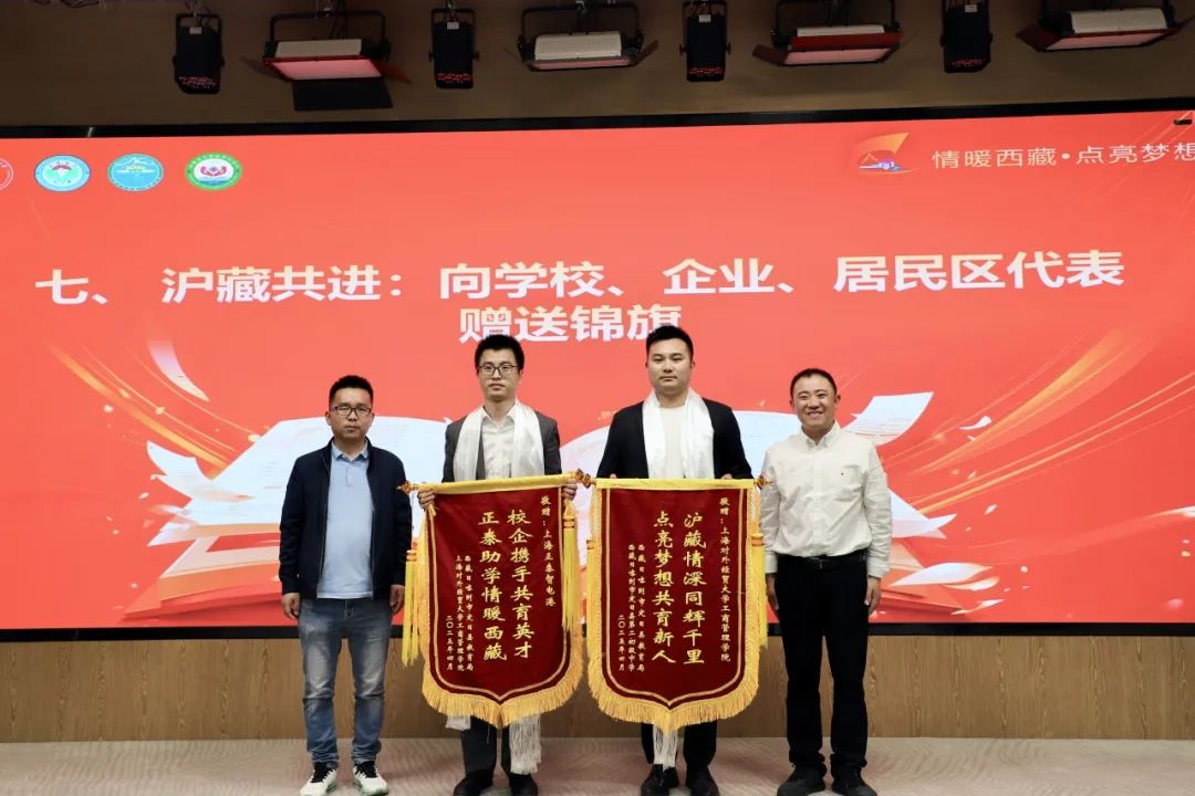 李本峰和汪海鯨向長期以來對滬藏交流給予大力支持的上海對外經貿大學工商管理學院、上海正泰智電港、廣富林居民區一一贈送錦旗,表達對各單位誠摯的感謝。