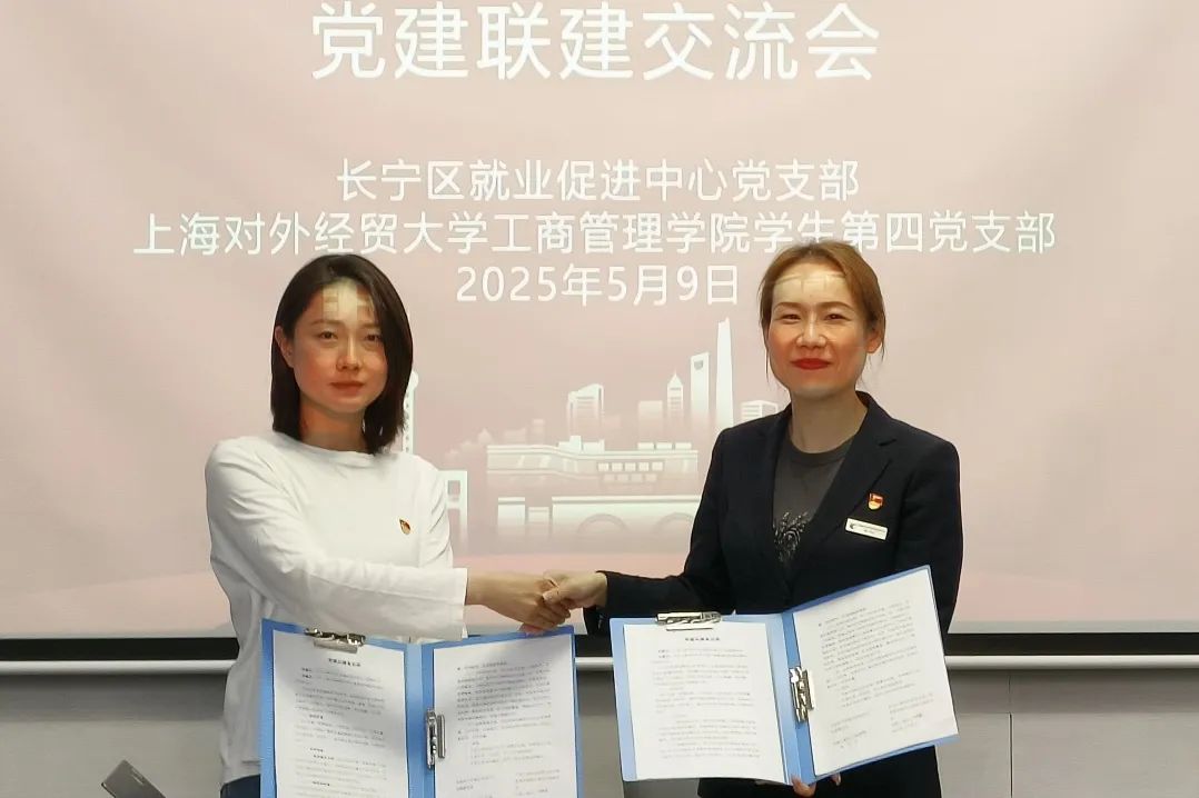 長寧區就業促進中心黨支部與上海對外經貿大學工商管理學院學生第四黨支部簽署共建協議。