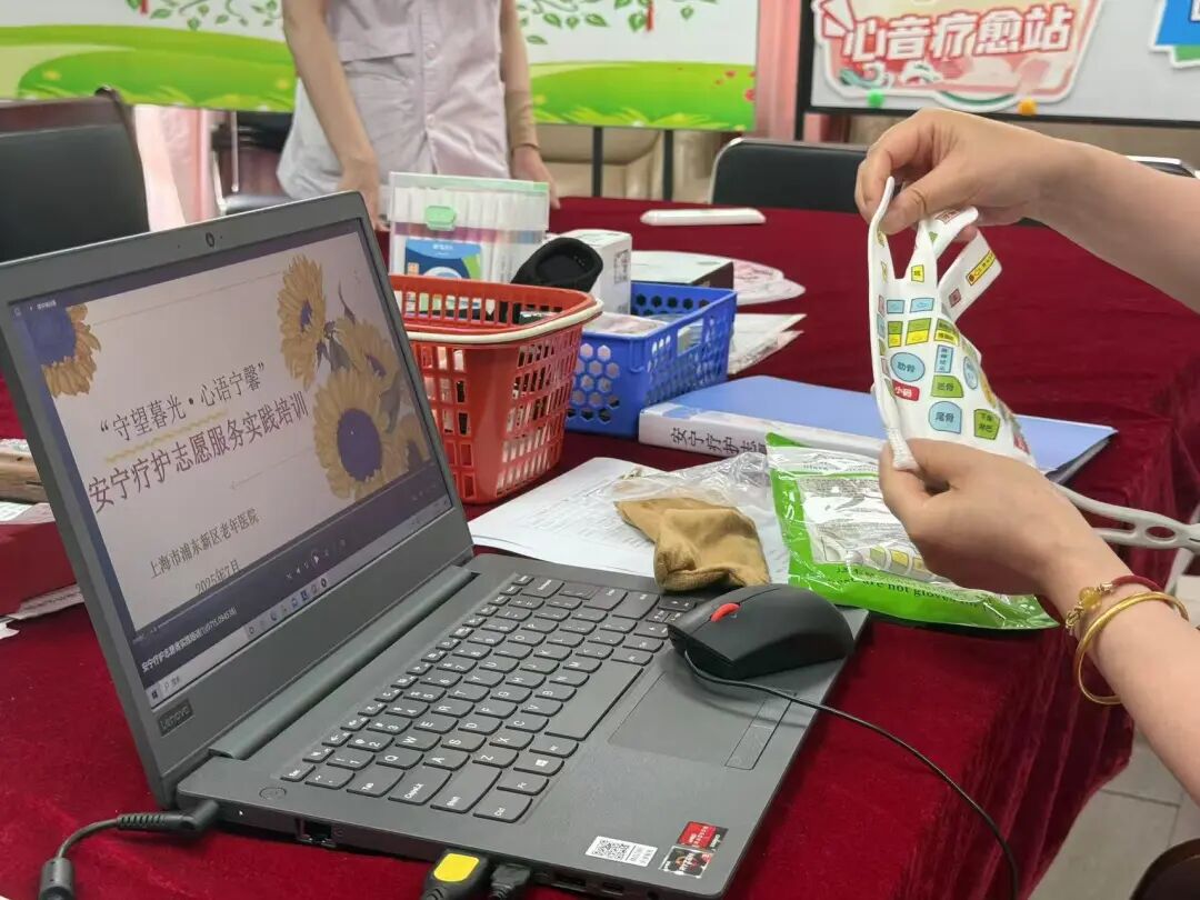 浦東新區(qū)老年醫(yī)院王華萍主任、兩位護(hù)士長(zhǎng)及一位帶隊(duì)老師熱情接待了調(diào)研團(tuán)隊(duì)。院方為調(diào)研人員分發(fā)了志愿者馬甲、志愿者證、安寧療護(hù)生命教育手冊(cè)及宣傳冊(cè)等物資。隨后,王華萍主任為團(tuán)隊(duì)開展了一場(chǎng)關(guān)于安寧療護(hù)志愿服務(wù)的實(shí)踐培訓(xùn),并強(qiáng)調(diào)了作為安寧療護(hù)志愿者應(yīng)具備的素質(zhì)要求,比如需要有同理心,不能將主觀想法強(qiáng)加在患者身上,同時(shí)需要有自我調(diào)節(jié)和自我照顧的能力。培訓(xùn)結(jié)束后,王主任還現(xiàn)場(chǎng)展示了安寧療護(hù)的各類療法和道具,這些都能在陪伴老人時(shí)有效舒緩他們的情緒。
