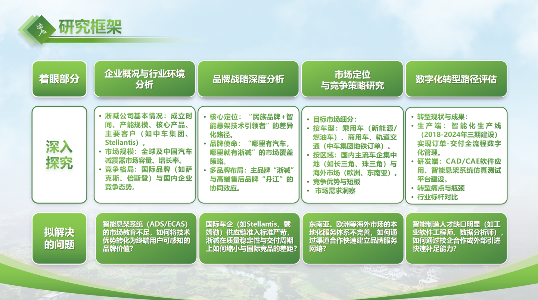 本次調(diào)研以民族品牌企業(yè)為出發(fā)點(diǎn),以淅減汽車減振器有限公司(以下簡稱“淅減”)為研究對象,旨在通過調(diào)研其品牌定位、目標(biāo)客戶群體,分析新能源汽車崛起、自動(dòng)駕駛技術(shù)普及等行業(yè)趨勢對減振器技術(shù)與功能需求的影響,探究這些趨勢為企業(yè)帶來的機(jī)遇與挑戰(zhàn)。同時(shí),全面梳理公司在研發(fā)設(shè)計(jì)、生產(chǎn)制造、供應(yīng)鏈管理、市場營銷、客戶服務(wù)等業(yè)務(wù)環(huán)節(jié)中數(shù)字化技術(shù)的應(yīng)用情況,評估應(yīng)用深度與效果,分析存在的問題與改進(jìn)空間,為民族企業(yè)的強(qiáng)國道路與數(shù)字化轉(zhuǎn)型提供多樣化的發(fā)展視角。