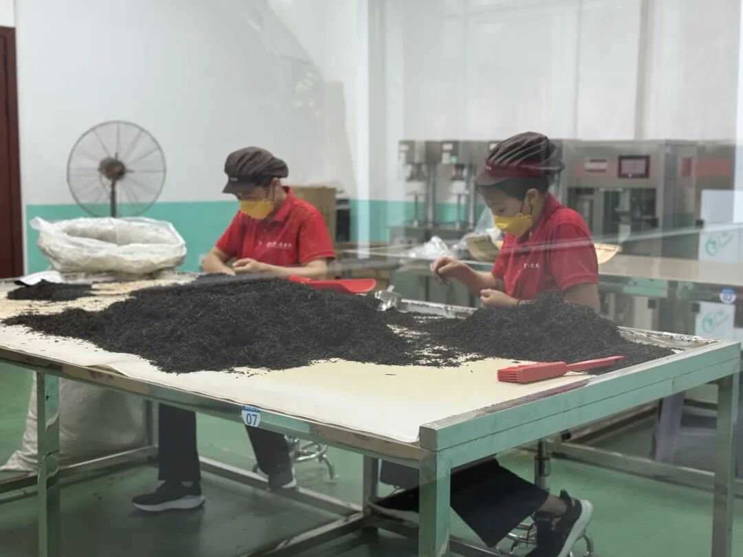 在參訪正山堂企業的過程中,團隊成員們走進清潔化生產車間,透過一整面透明墻,清晰看到茶葉萎凋、揉捻、發酵、干燥的全過程,兩位工作人員在另一個進行著手工揀茶。