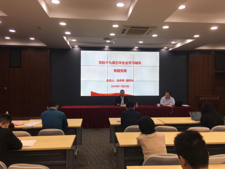 為扎實推進 “四史”學習教育工作,深刻領會十九屆五中全會精神。11月20日上午,副校長徐永林應邀為學院教工黨支部和學生黨支部黨員作十九屆五中全會學習輔導報告專題黨課?;顒佑蓪W院黨總支書記武增勇主持,學院全體黨員參加了本次黨課學習活動。