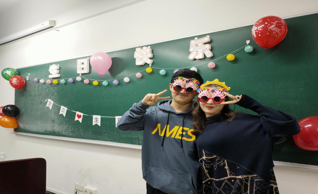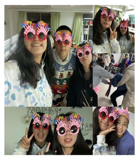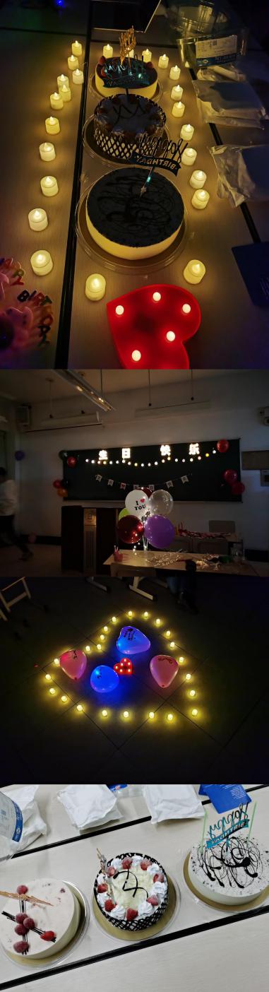 下午五點半開始同學們已經在教室進行布置了,給五顏六色的氣球打氣、在地上擺上愛心形狀的蠟燭、在墻和窗戶貼上生日快樂字樣的卡片......大家在班委的組織下互相幫助、有條不紊地裝扮教室,給壽星們準備一個完美的生日會。在將近兩個小時的精心布置下,整個教室變得溫馨而溫暖,大家已經迫不及待想要開始這場特殊的生日聚會了。