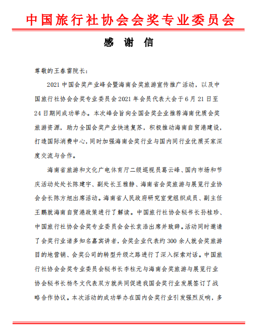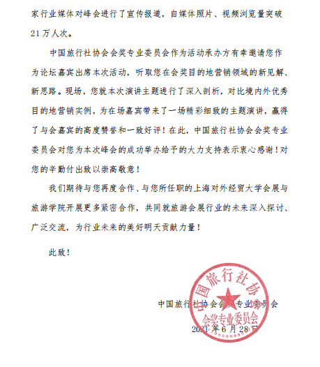 近日,中國旅行社協(xié)會會獎專業(yè)委員會專門發(fā)來感謝信,并期望和會展與旅游學(xué)院開展更緊密的合作,共同推動中國旅游及會展行業(yè)的長足發(fā)展。