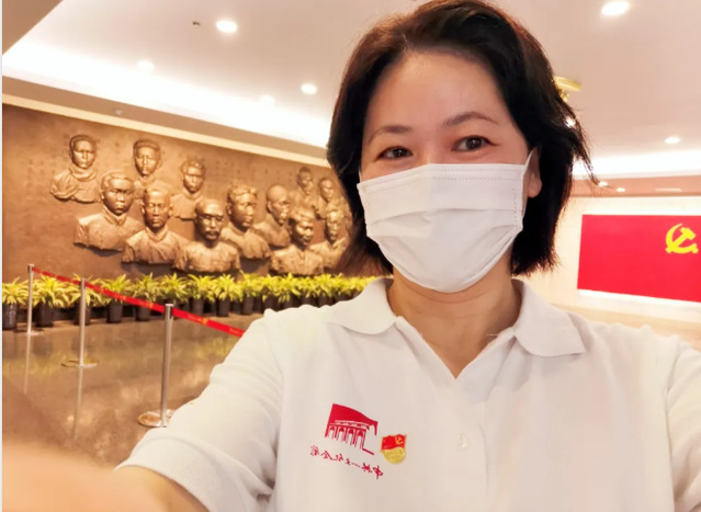 “今年六月,經(jīng)過初試、面試及崗位培訓(xùn),我成為了黨的誕生地的一名志愿者。我的崗位是宣誓教育,主要工作內(nèi)容是:做好宣誓團隊的登記工作;控制宣誓人數(shù);引導(dǎo)宣誓人員進入宣誓區(qū),指引團隊列隊并保持隊伍的整齊。等列隊完成后,志愿者站于黨旗左側(cè)并保持立正姿勢,同時,莊嚴(yán)地發(fā)出七步指令,使宣誓儀式能順利完成。今年恰逢建黨百年,又是新館剛開放,所以參觀及宣誓的觀眾特別多,志愿者要維持秩序及引導(dǎo)完成宣誓流程,所以一天下來常常嗓子就嘶啞了。但是看到觀眾們宣誓時莊嚴(yán)肅穆的表情,聽到他們鏗鏘有力的宣誓聲,就覺得志愿者的工作平凡但有意義。”