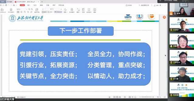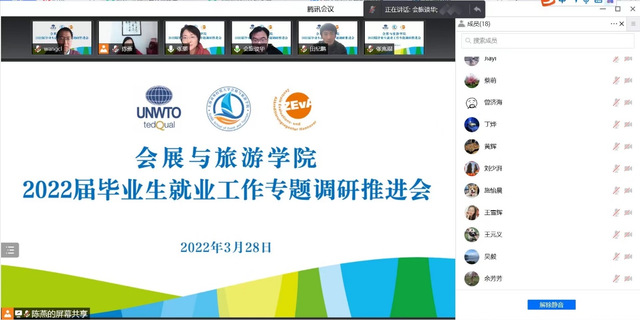 “對于畢業(yè)生來說,就業(yè)是最大的民生問題”。為了應對新冠疫情和嚴峻就業(yè)形勢的疊加影響,切實做好2022年畢業(yè)生就業(yè)促進工作,3月28日下午,會展與旅游學院在線召開了“2022屆畢業(yè)生就業(yè)工作專題調(diào)研推進會”。學校黨委副書記吳毅、就業(yè)指導中心李蕾老師應邀出席,學院領(lǐng)導班子全體成員、教工黨支部書記、系主任、學院辦公室主任、學工辦主任、畢業(yè)班班主任、輔導員及畢業(yè)生代表參會,會議由院長王春雷主持。