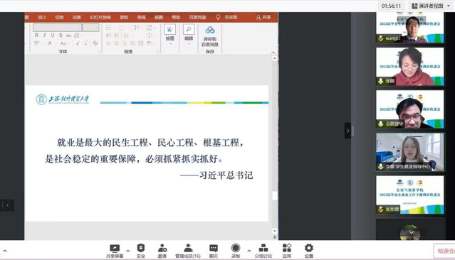 李蕾老師詳細介紹了學校2022屆畢業(yè)生就業(yè)工作進展情況,從供需結(jié)構(gòu)、就業(yè)進度、畢業(yè)生就業(yè)心態(tài)等方面分析了當前就業(yè)形勢,并就學院如何切實做好就業(yè)促進工作提出了指導性建議。