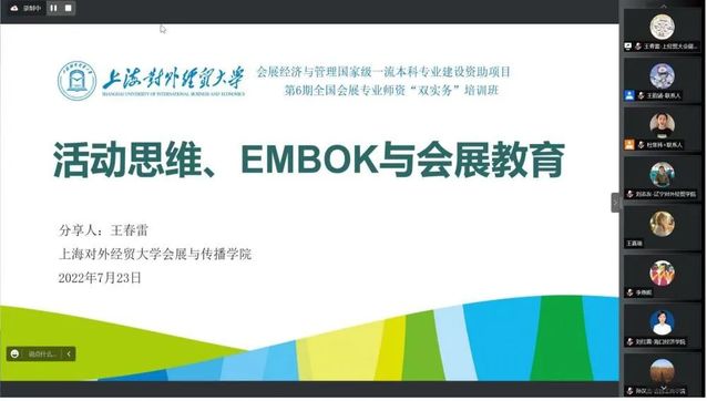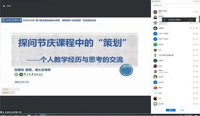 2022年7月23日,第六期全國會展專業(yè)師資“課程教學(xué)+項目管理”雙實務(wù)培訓(xùn)班在線成功開班。來自全國112余所高校的290余名從事會展、旅游、傳播及相關(guān)專業(yè)教學(xué)、科研工作的高等院校教師齊聚云端參加此次培訓(xùn)班。該培訓(xùn)班自2015年7月以來已成功舉辦五期,2022年第六期全國會展專業(yè)師資“課程教學(xué)+項目管理”雙實務(wù)培訓(xùn)班主要探討受新冠疫情、數(shù)字化營銷等多種因素影響下的會展教育,旨在圍繞會展學(xué)科建設(shè)、會展教學(xué)實踐與更多會展專業(yè)教師分享和探討會展人才培養(yǎng)及會展教育教學(xué)的經(jīng)驗與體會。