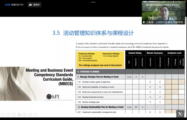 從理論視角出發(fā)對活動進(jìn)行梳理,介紹其依托理論與密切相關(guān)領(lǐng)域。對活動教育的三個層次及其在會展教育中的應(yīng)用進(jìn)行闡述,結(jié)合IEMS實例向廣大老師介紹其辦學(xué)定位、知識設(shè)計體系、綜合活動、課程教學(xué)安排和日常生活。同時也將EMBOK(活動管理知識體系)和會展專業(yè)課程設(shè)計結(jié)合起來,對EMBOK的內(nèi)容與課程設(shè)計的框架進(jìn)行分享,總結(jié)活動管理教育的國際經(jīng)驗,并對未來的會展教育提出暢想。王春雷教授結(jié)合豐富的案例對活動思維、EMBOK和會展專業(yè)課程設(shè)計等內(nèi)容進(jìn)行分享,貼合實際教學(xué)情境來和眾多老師進(jìn)行探討交流。