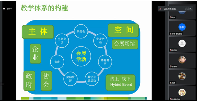 經過大一上學期《會展職業與能力》課程知識積累,張麗老師將《會展概論》課程定位為一門兼具廣度、深度、熱度的專業入門基礎課。對這門課程教學內容設計的原則提倡體系化+系統化、產業化+商業化運營模式、國家化+本土化、理論+案例+考察實踐+策劃實操。將會展活動的形式劃分為展覽會、企業活動、體育賽事、協會會議等七大類,搭建以企業、政府、協會為主體,以會展場館、會展城市為空間的線上、線下會展活動的教學體系。同時張麗老師也提出了目前在教學中遇到的困難以及自身的一些思考,認為《會展產業概論》不等于《會展概論》,需要對會展的社會文化功能和價值進一步深入挖掘。