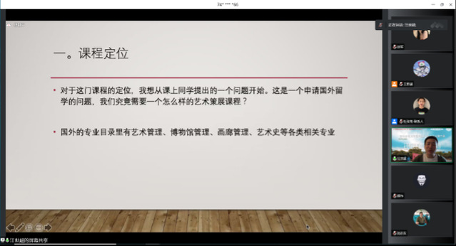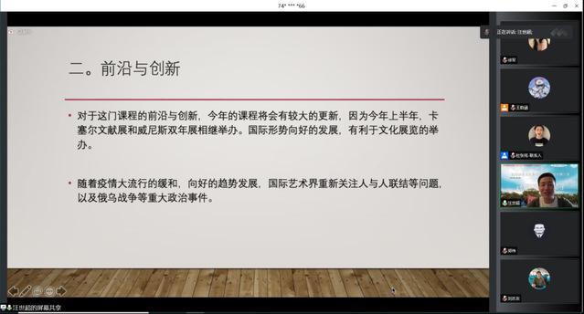 上午場另一位分享老師是來自上海對外經貿大學會展與傳播學院歷史學博士汪世超老師,他以“《藝術策展管理》教學設計與課程示范”為主題為大家帶來分享。汪老師從課程定位、學術前沿與創新、課程思政元素以及課程設計再思考等角度來分享這門課程,并且列舉洛陽博物館、活動海報等案例生動詮釋藝術策展的重要性。