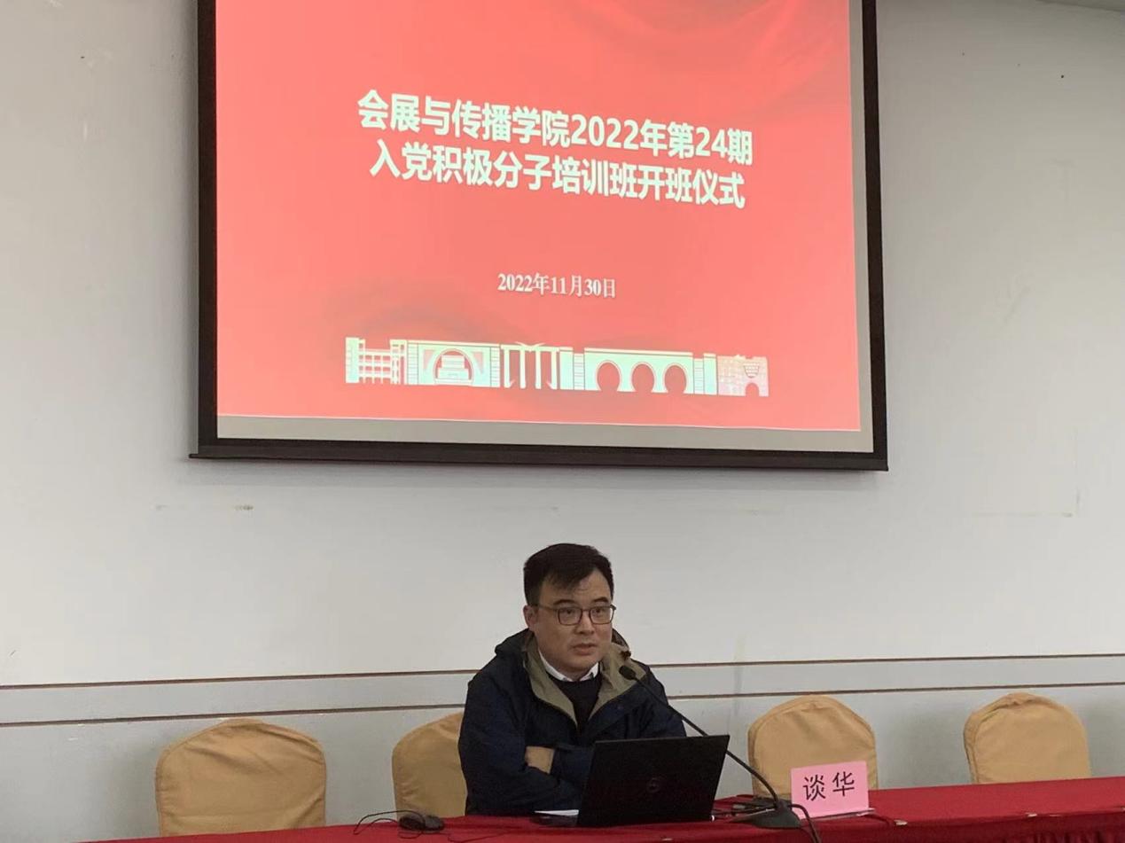 開班儀式上,談華進行了開班動員并開設題為《把握五個牢牢把握 學深悟透黨的二十大精神》的黨課,對黨的二十大報告進行了全面系統的梳理,歸納總結了框架要點,帶領同學們深入認識報告的重大意義,并分享了“五個牢牢把握”的學習方法。他勉勵學員要正確認識學習培訓的重要性,珍惜學習機會,通過系統的教育培訓,進一步了解黨的歷史、性質、宗旨、任務、紀律等等,進一步端正入黨動機,力爭通過學習為早日加入黨組織打下堅實的思想基礎。