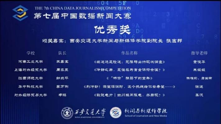 11月26日下午,會展與傳播學院新聞學(經濟新聞報道方向)專業的兩支學生隊伍在第七屆中國數據新聞大賽中摘取優異成績。2019級新聞專業陳旭濤、劉萍、陳盼盼、常馨以、陸倍瑩團隊斬獲一等獎,2020級周奧嵐、王兆彬、付雨涵團隊獲得優秀獎,朱媛媛老師獲優秀指導教師獎。