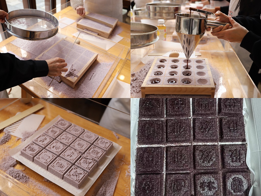 在制作師傅們的指導下,大家迫不及待的開始制作自己的糕點,在經歷了篩粉、注芯、脫模、入籠等工序后完成了自己的“作品”。