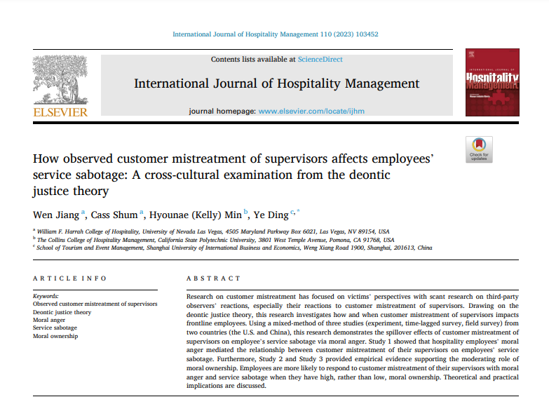 丁燁博士與合作者的論文《How observed customer mistreatment of supervisors affects employees’ service sabotage: A cross-cultural examination from the deontic justice theory》在旅游管理學科頂尖期刊《International Journal of Hospitality Management》在線發表(2023年第4期)。該期刊被我校列為國際二類期刊。