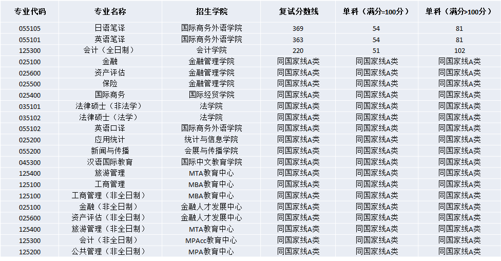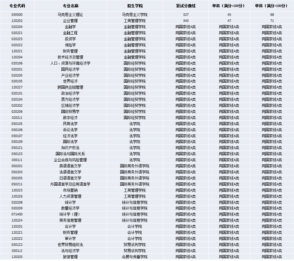 在教育部公布的《2023年全國碩士研究生招生考試考生進入復試的初試成績基本要求》(國家分數線)A類考生總分和單科要求的基礎上,經我校研究生招生領導小組審議,學校校長辦公會議通過,現確定上海對外經貿大學2023年碩士研究生招生復試分數線。
