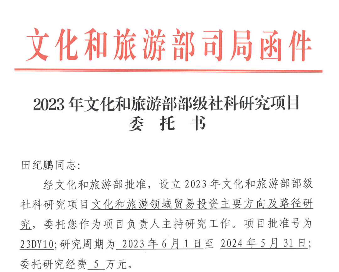 近日文化和旅游部科技教育司正式公布了2023年文化和旅游部部級社科研究項目立項委托書,田紀鵬副教授負責申報的《文化和旅游領域貿易投資主要方向及路徑研究》(23DY10)獲批立項。