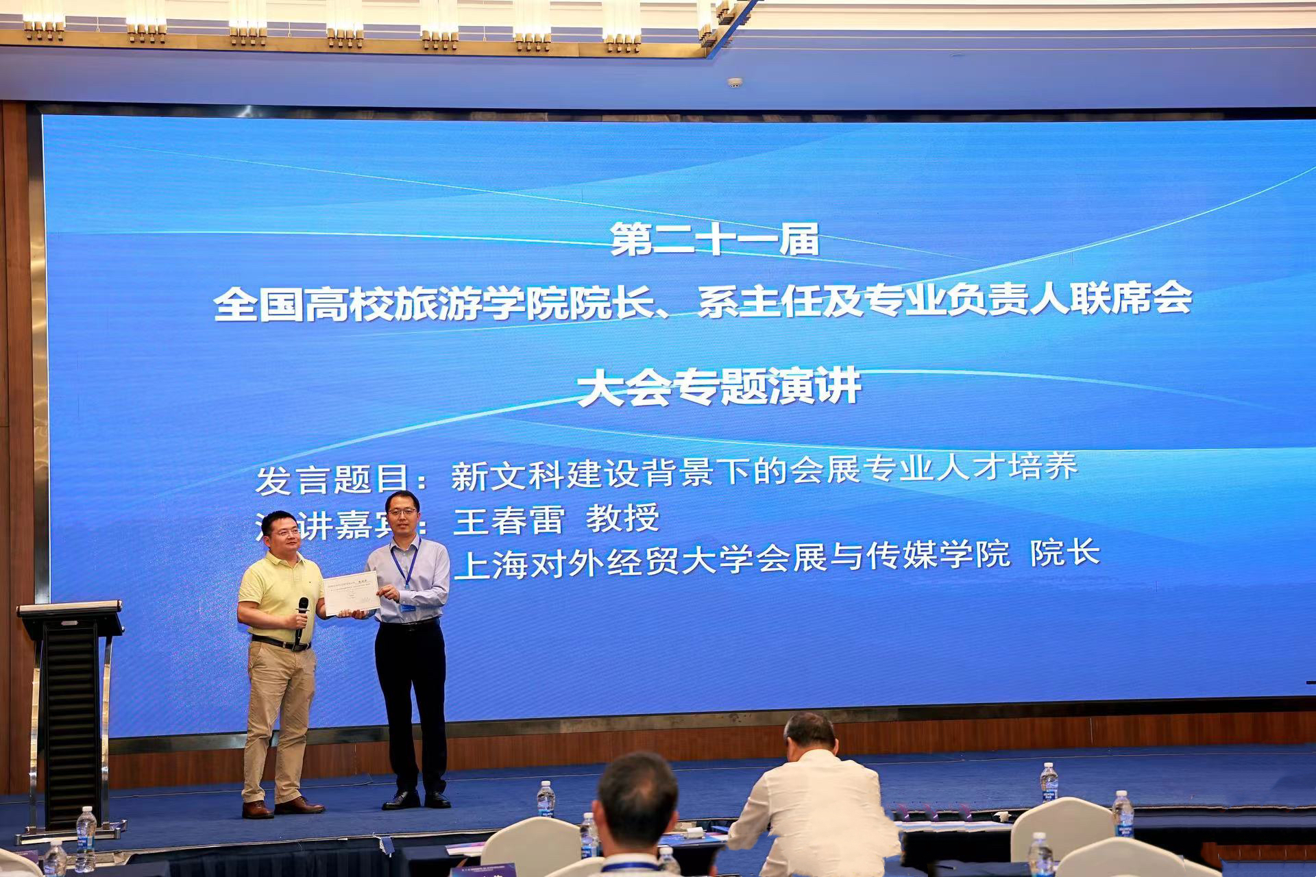 我校會展與傳播學院院長王春雷教授應邀發表大會專題演講,他演講的題目是《新文科建設背景下的會展專業人才培養》,從新文科的提出、旅游管理類專業新文科體系的構建以及會展人才培養創新實踐3個方面做了分享,受到與會代表一致好評。