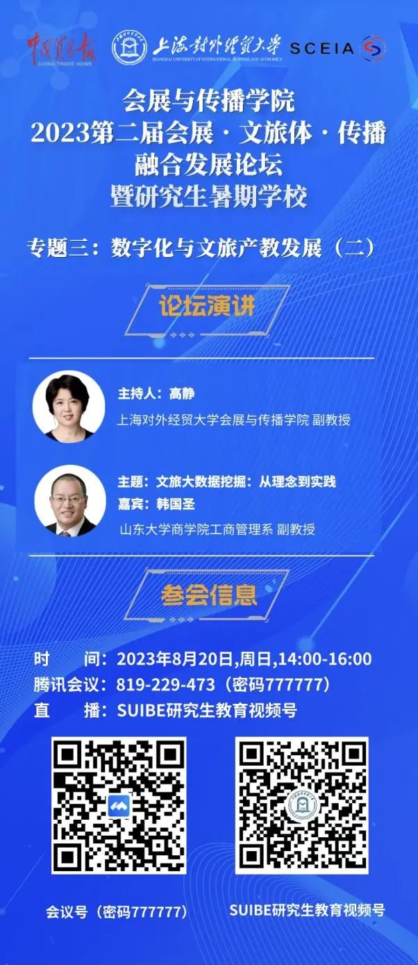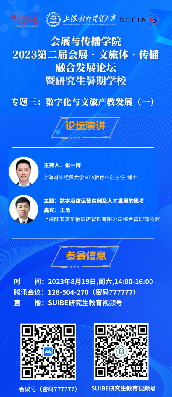 8月19日至20日,由上海對外經貿大學、《中國貿易報》社和上海市會展行業協會主辦,上海對外經貿大學會展與傳播學院、上海對外經貿大學研究生院和長三角會展研究院承辦的2023第二屆會展·文旅體·傳播融合發展論壇暨研究生暑期學校融合發展論壇演講板塊之“專題三:數字化與文旅產教發展”在線順利舉行。上海陸家嘴東怡酒店管理有限公司綜合管理部總監王勇和山東大學商學院工商管理系副教授、博士生導師韓國圣分別作為演講嘉賓為論壇帶來了精彩紛呈的演講。為期兩天的論壇分別由上海對外經貿大學MTA教育中心主任張一博和會展與傳播學院副教授高靜主持。